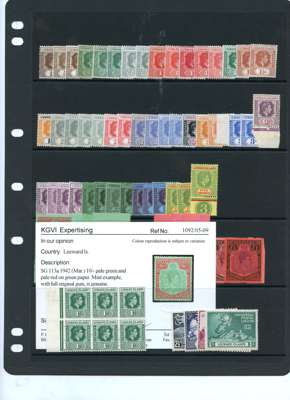 1938-51 mint definitives collection (64) on Hagner sheet, with shades per SG and CW (plus some extras), unmounted o.g. with the exception of the first £1, which is large part o.g. The 1951 5/- is a Plate 3 example (exceptionally scarce). The 1942 10/- pale green and pale red on green paper has a KG VI Expertising Certificate (2009). Also includes the 1d green in a marginal block of six with R7/3 LP ‘DI’ flaw. A fine collection. SG 95-114c