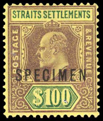 1902-3 $100 purple and green on yellow paper overprinted SPECIMEN Type D12, fine large part o.g. SG 122s, £800