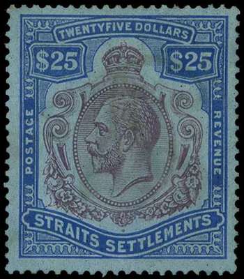 1923 $25 purple and blue on blue paper, watermark Script. Has been fiscally used, cleaned and regummed; good appearance and a fine spacefiller. SG 240b (£1500 mint)