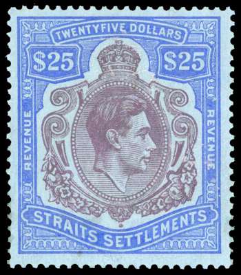 Postal Fiscal. 1938 $25 purple and blue on blue paper large part o.g., apparently unmounted but with a patch of missing gum at lower left on the reverse, fine appearance with wonderful colour. SG F1, £1400