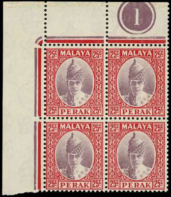 1938-41 25c dull purple and scarlet upper left corner Plate block of four, fine unmounted o.g. SG 115, £200