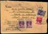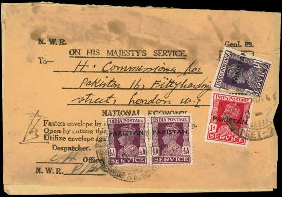 Officials: 1948 overprints on India. Reused OHMS envelope with economy label to London, bearing Lahore machine prints on ½a (2), 1a and 1½a (latter damaged) with railway cancels, one ½a with damaged overprint. D&I O85, 87-8