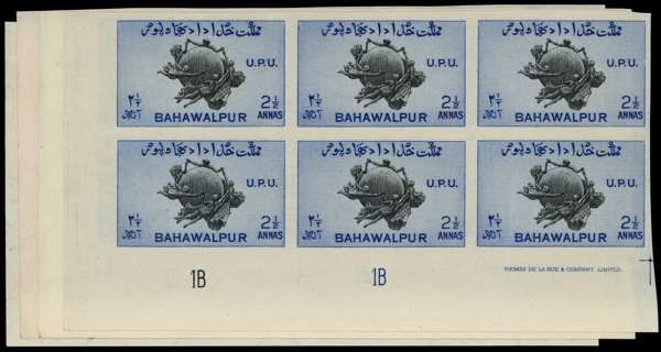 1949 UPU set in imperforate corner blocks of six with imprint and Plate numbers, hinged on the selvedge only with the stamps unmounted o.g. 2½a with a wrinkle affecting one stamp. SG 43-6 (see footnote)