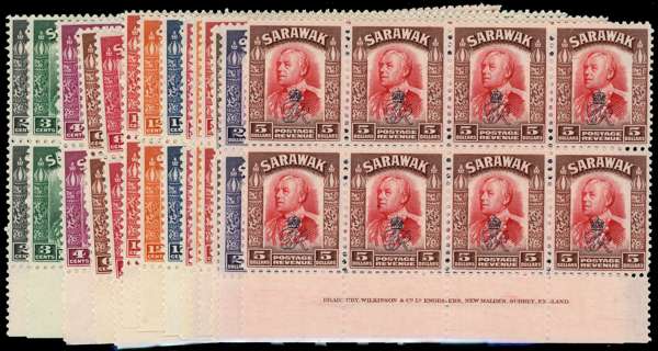 1947 Royal Cypher set in imprint blocks of eight, fine o.g. Hinged on the top left and top right stamps only. SG 150-164, £192