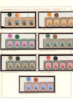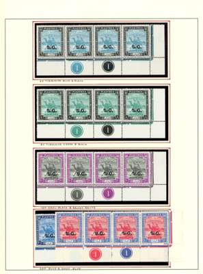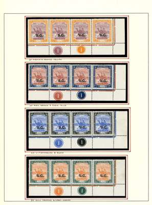 Officials. 1948 set in o.g. corner strips of four with both Plate numbers, the low values from the upper left corners with the stamps unmounted, the 2p upwards from the lower right corners with one or two stamps hinged. SG O43-58, £520