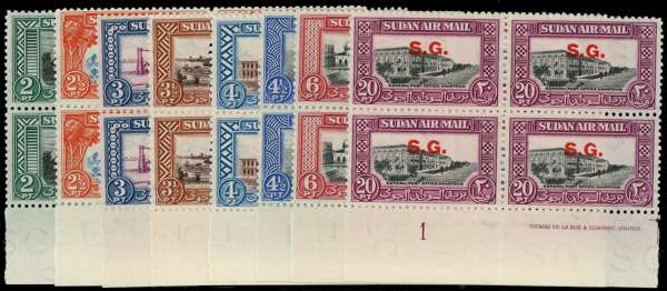 Officials. 1950 Air set of eight in lower marginal blocks of four with imprint and Plate numbers, centrally vertical folds otherwise fine unmounted o.g. SG O59-66, £120