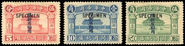 1916 unissued Hung Hsien Commemoration set of three to 50c grren, optd 'SPECIMEN' mint part o.g. gum a little toned and rather heavily hinged, otherwise fine, a scarce set. Chan AP4-AP6