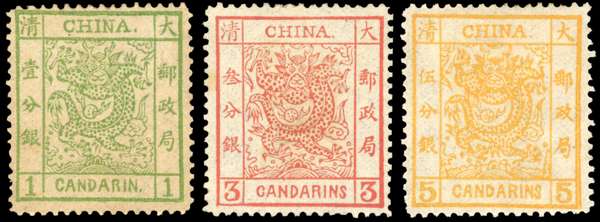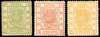 1878 1ca green, 3ca brown-red and 5ca organe, thin paper 2½mm spacing, 1ca, 3ca with minor even toning, part (3c) or large part o.g.