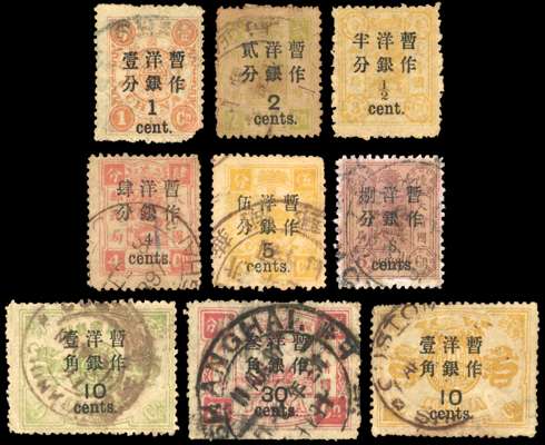 Dowager: 1897 4c on 4ca and a bleached 8c on 6ca Small Surcharges, Large Surcharges ½c on 3ca unused without gum, 1c on 1ca used with rounded bottom right corner, 2c on 2ca heavily toned used, 5c on 5ca slight overall toning used, 10c. on 9ca used large part Customs Chinkiang date stamp, 10c on 12ca used part Customs Shanghai date stamp and a 30c on 24ca used with large part Dollar Chop with trimmed perfs at base.