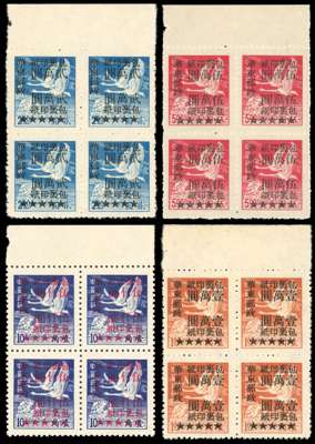 China PRC Regional East China 1949 Parcels Post surcharge set of four in top marginal blocks of four fine unused without gum as issued