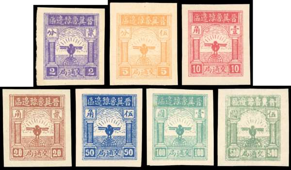 North China: Shanxi-Hebei-Shandong-Henan Border Area 1943 set of 7 to 500c pale bluish-green, unused without gum as issued, fine and scarce. SG NC70-76