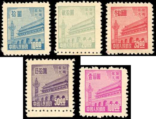 Port Arthur & Dairen: 1950 Tien an men set of $5 to $100 deep magenta, fine unused, the $20 uncommon. SG NE75-79