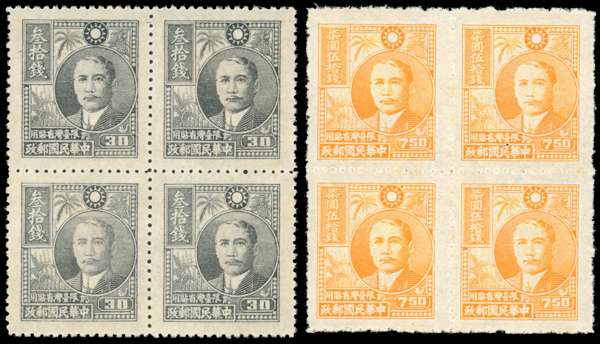 1947 Sun Yat-Sen, the unissued 30c grey and $7.50 orange in blocks of four, a few trivial tones which in no way detract from these rare multiples, unused without gum as printed.