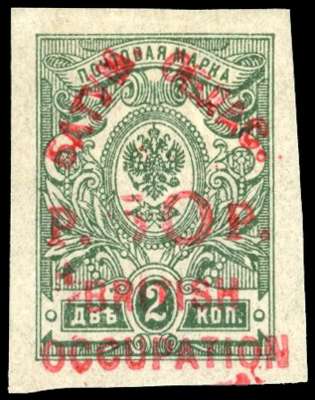 1920 (12 Jan) 50r on 2k yellow-green Type 4 surcharge in red, imperforate with large margins, fresh large part o.g. Only 300 issued. BPA Certificate (2004). SG 22, £1000
