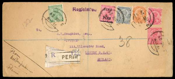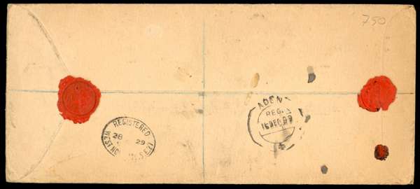 1929 registered envelope (9 x 4") to London bearing India 1911-23 3p and 1a, 1921 9p on 1a, 1922-6 1½a and 2a6p, and 1926-33 ½a, tied by four good strikes of Perim CDS of 2 DEC. Provisional registration label. Backstamped Aden and West Norwood. Minor soiling and creasing, still a rare cover. SG Z445, 447, 459, 461-2, 465 (all unpriced)
