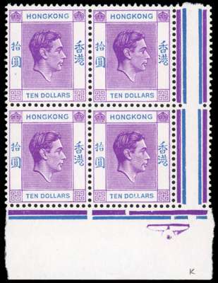1938-52 $10 (bright) reddish violet and blue, chalk-surfaced paper, lower left corner block of 4, fresh unmounted o.g. Stated to be from requisition "K" (1011 sheets), showing progressive damage to Chinese figure "10" (left pane, R10/6). Very scarce.