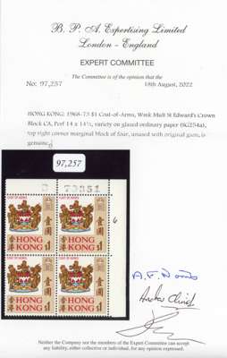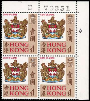 1968-73 $1 "Arms", wmk w12 upright, GLAZED ORDINARY PAPER, upper right corner block of 4 with requisition number "B 79351", unmounted o.g. A very rare positional piece. SG 254a