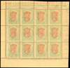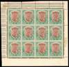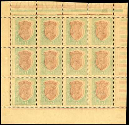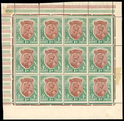 1911-22 1r red-brown and deep blue-green, wmk single star. complete pane o 12 (4x3) from lower right corner of the sheet with partial inter-pane margins, showing on gummed side a complete ‘double offset’ of both vignette and frame in their respective colours, and also a partial offset of the vignette in GREEN, fine o.g. (Odd minor wrinkles and marginal separations but the stamps themselves unmounted). A spectacular and extraordinary item, of great technical interest, exhibiting a phenomenon only compatible with rotary printing plates. A very rare occurrence on stamps printed by De La Rue.