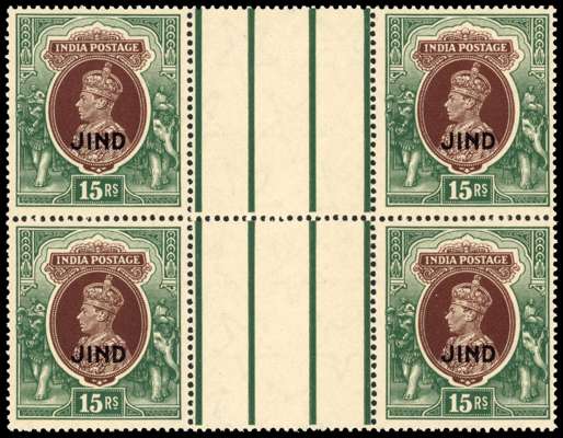 1941 JIND1941-43 15r brown and green "JIND", wmk inv as always, interpane block of 4, unmounted o.g. Attractive and scarce in this form. SG 135 cat £900+