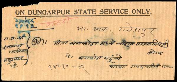 1942 (13 Oct) printed 'ON DUNGARPUR STATE SERVICE ONLY' cover, franked on reverse at 1½a rate by 1939-46 ½a vermilion (Die I), perf 12 on two sides, and 1a deep blue, perf 11 all round, tied by individual very clear strikes of violet cds. Typical cover folds and gum marks, still a fine cover, much above average, and a rare franking with the ½a perf 12. SG 10,11a