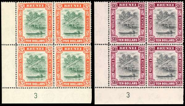 Brunei SG 91-2 1947 $5 and $10 Plate blocks mint