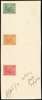 1926 (12 Feb) piece ex De La Rue archives (74 x 186mm) with perforated colour trials for the 1922-34 Script wmk 2c green (issued 15/6/26), 4c orange (issued 9/11/26) and 6c scarlet (issued 9/11/26), endorsed 'Appd for colour' with M/S initials and date at foot. Crucially, ALL ARE WMK UPRIGHT and therefore of proof status, as the issued stamps were invariably wmk sideways. A unique and highly desirable item, This trio formerly listed as SG 55a, 60b and 64a which are now priced in the footnote priced at £1,250 each after the discovery of this piece proving their proof status in 2013.