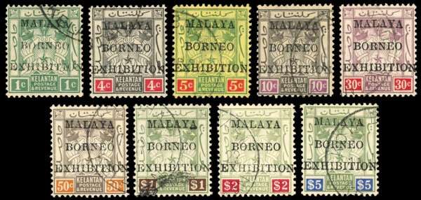 1922 ‘Malaya-Borneo‘ set of 9 to $5, good to fine used. Odd minor imperfections ($5 short perf), still a really fine set, most with part Kota Bharu '11 APR 22' cds. Rare in used condition. SG 30-38 (cat £1100)