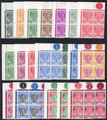 1951-55 set of 21 to $5, upper left corner blocks of 4 with plate numbers "1" or "1 1", fresh unmounted o.g. Attractive and now extremely scarce in this matching positional form. [N.B. The 2c shows variety "Tiny stop" on R1/2.] SG 61-81