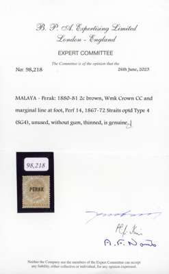 1881 2c brown overprint type 4, unused without gum, defective; surface scuffs at left, thinning, still good appearance and an acceptable spacefiller or reference example. SG 4, £2500, BPA cert 2023.