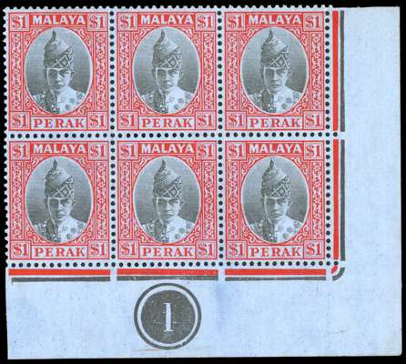 Malaya Perak SG 119 1938 $1 Plate block of six mint
