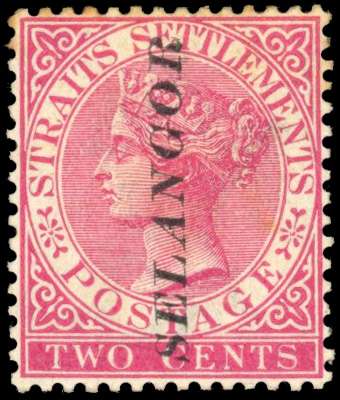 1885-91 2c pale rose, type 29 (vertical) opt on Straits Settlements, mint large part o.g., slight perf staining at top (mainly confined to reverse) otherwise fine with fresh colour, very scarce. SG 37, cat £475
