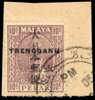 1944 Perak 10c with Kanji overprint, further overprinted TRENGGANU Type TT1, used on piece with part Kuala Trengganu CDS. A really fine example of this very rare stamp, of which six are recorded. SG TT12 (unpriced)