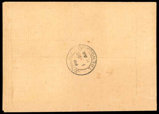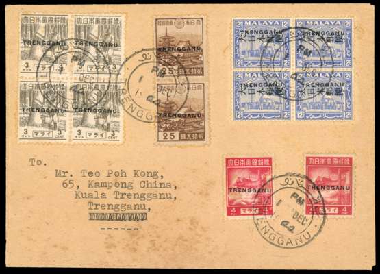 1944 (1 DEC) locally addressed cover, Kuala Trengganu CDSs, the earliest known date. Mixed franking, all with TRENGGANU Type TT1 overprint; Selangor 12c and Pictorial 3c blocks, Pictorial 4c two singles and Japan 25c vertical pair. The envelope with a vertical fold, and some staining which the stamps have largely escaped. SG TT15, 21-2 and 33, catalogued £3350