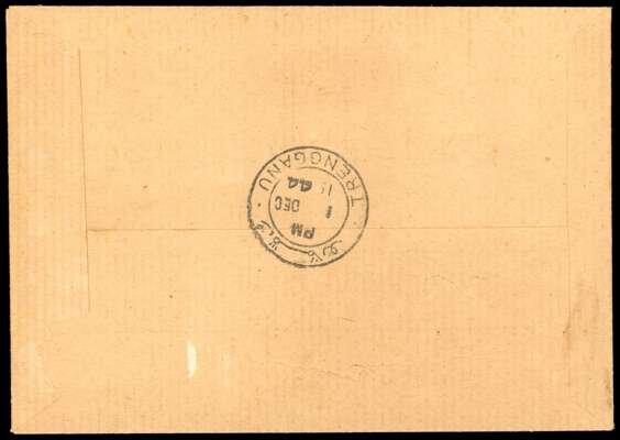 1944 (1 DEC) local envelope bearing 3c Pictorial (four vertical pairs and two singles) and 25s Japan vertical pair, all with TRENGGANU Type TT1 overprint. Kuala Trengganu CDSs of 1 DEC, the earliest known date. A little staining around the edges of some of the stamps, which catalogue £3350