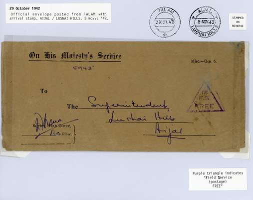1942 OHMS envelope (10 x 4½") to Aijal unstamped, carried by runner, the postage paid by violet triangular ‘101/ F.S./ FREE’ handstamp, ‘F.S.’ standing for Field Service. Despatched from Falam on 29 OCT and received at Aijal 9 NOV. In the 1983 census this was the only unstamped cover recorded, and as such is a rarity. Some wrinkles and minor creasing, as to be expected; ex Gerald Davies