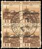 1944 Japan 25s brown and chocolate overprinted TRENGGANU Type TT1 block of four, central Kuala Trengganu CDs of 1 Dec (earliest known date). Fractional separation at top and on the reverse, some very slight staining around the central vertical perf holes; fine appearance. About 100 used examples are recorded. SG TT33, £1200