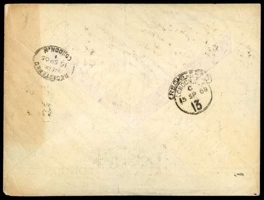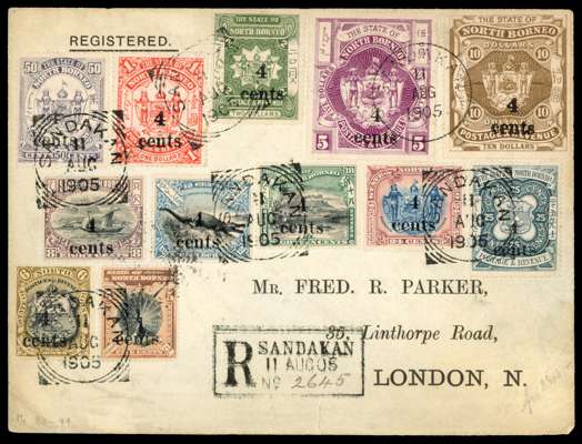 1905 Parker cover registered from Sandakan, bearing the 1904 ‘4c’ surcharge set with squared circle cancels of 11 AUG 05. The envelope with some edge faults and ageing, still attractive and quite scarce. SG 146-157