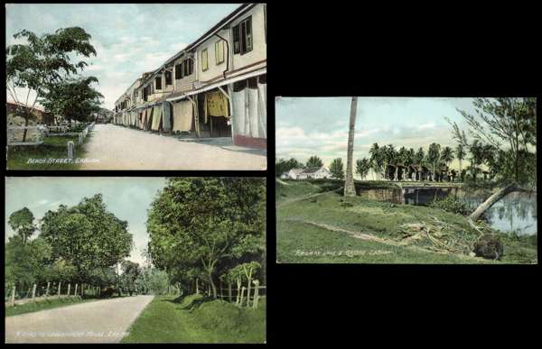 Group of three divided back picture postcards in colour showing Labuan scenes (Beach Street, A road to Government House, Railway Line and Bridge), fresh unused.