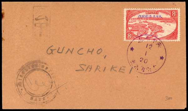 Japanese Occupation; Postal History. 1945 cover to Sarikei bearing Brunei 8c red (SG J10) tied by fine violet single-ring CDS of 12 1 20. District Office and Censor Chop on front. Ex Rowell