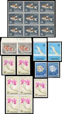1962-66 group of varieties and errors, comprising 5c horizontal pair with sheet number showing perforation shift, 10c block of 9 showing shift of orange to left, 10c half sheet of 50 with cylinder numbers showing black ink smudges on columns 6 and 9, 15c with orange omitted, 20c with orange omitted (gum disturbance - cat £1500), 30c yellow omitted, and 30c block of 4 with upward shift of pink, very mixed cond with some toning noted, close inspection strongly recommended.