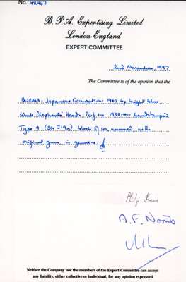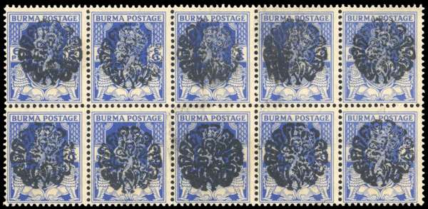 1942 KG VI 6p bright blue with Pyapon Peacock block of ten mint, unmounted o.g. SG J19a