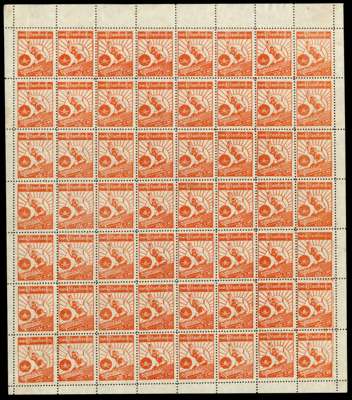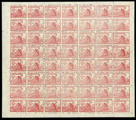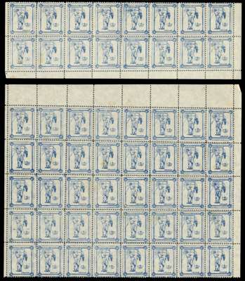 1943 Independence Day sheets of 56, perf 11, unused without gum as issued. The 5c with R5/6 skyline flaw. SG J82-4a, £3204