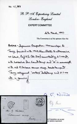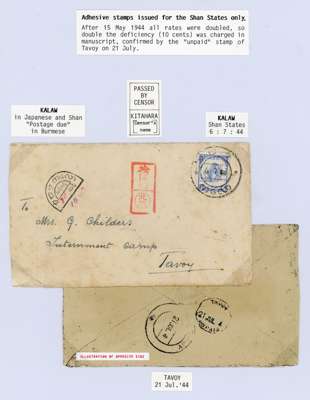 1944 (6 JUL) censored cover from Kalaw, Shan States to 'Mrs G. Childers, Internment Camp, Tavoy', underfranked by 1943 (1 Oct) Shan States 5c ultramarine, tied by bilingual (Shan-Burmese) KALAW cds, with very fine trilingual (Shan Burmese Japanese) horseshoe tax mark of Kalaw, completed for '10c' at left. Exceptional red Japanese censor chop (with separate seal of censor 'Kitahara') at centre. On reverse, Tavoy arrival cds and 'TAVOY/UNPAID' octagonal ds, both dated '21 JUL 4'. Trivial toning and imperfections but a wonderful cover of the highest importance and rarity, with stunning visual impact. A true star item of the entire occupation period, further enhanced by the extraordinary biography of the addressee provided below! Ex Gerald Davis (6/4/2005, Lot 371) and offered on his exhibition page, with BPA cert (1997).
