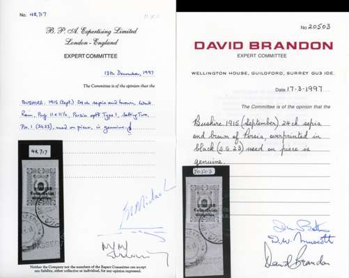 1915 Coronation 24ch sepia and brown overprinted in black from Type I, setting II, position 1 used on censored piece with part cds, BPA Certificate (1997). SG 23, £1,500.