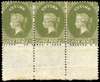 1867-70 5d olive-green, wmk CC (type 6), horizontal strip of three from foot of sheet with fine colour and full margin below, large part o.g. Unobtrusive crease in margin (and one stamp with an insignificant trace of a tone speck, as often with this stamp), still a rare and striking positional multiple. SG 66b