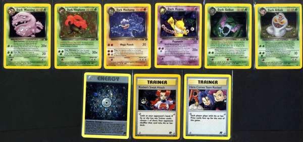 Dark Arbok, Dark Golbat, Dark Hypno, Dark Machamp, Dark Vileplume, Dark Weezing, Here Comes Team Rocket, Rocket's Sneak Attack, Rainbow Energy