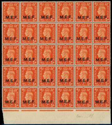 1942 Nairobi 2d round and square stops block of thirty, unmounted o.g., marginal at base. The second row with square stops, the remainder round stops. Three round stops stamps have small foxed spots on the reverse, giving six fine se-tenant pairs and fifteen fine round stops stamps. Selvedge signed Alberto Diena, Brandon Certificate (1999). SG M7a, b, £3990