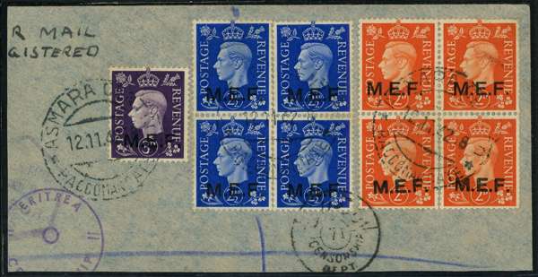 1942 Nairobi 2d square and round stops block of four, used on piece with Harrison 3d single and 2½d block of four. Asmara Centro registered CDSs dated 12 11 42, the piece also with two censor handstamps. A rare piece. SG M7b, £1500