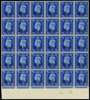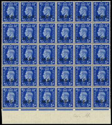 1942 Nairobi 2½d round and square stops block of thirty, unmounted o.g., marginal at base. The second row with square stops, the remainder round stops. Six se-tenant pairs and eighteen round stops stamps. Selvedge signed Alberto Diena, Brandon Certificate (1999). SG M7a, b, £3120