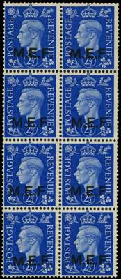 1942 Nairobi 2½d round and square stops block from rows 1-4, fine o.g. The upper and lower blocks round stops, hinged, the central block square stops, unmounted. SG M8b, £1300